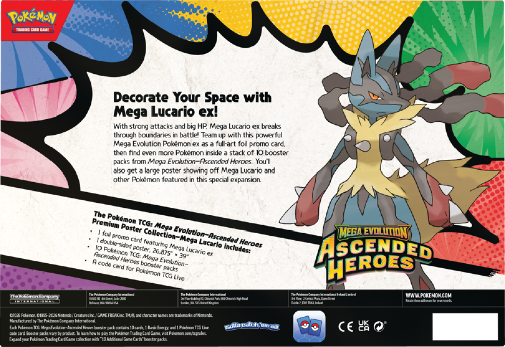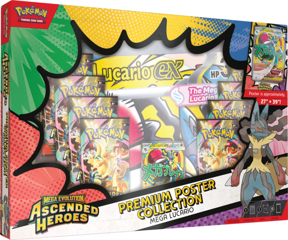 بوكيمون، بطاقات بوكيمون، Pokémon TCG، Mega Evolution، Ascended Heroes، Premium Poster Collection، Mega Lucario EX، بطاقات نادرة، منتجات بوكيمون 2026، هواة جمع البوكيمون، ألعاب بطاقات، Pokémon boosters، Promo Card، Poster، Code Card، Pokémon collectibles.