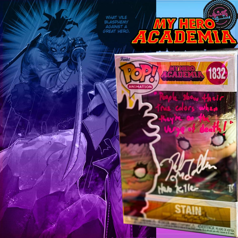فانكو بوب ستين، Stain Funko Pop MHA #1832، توقيع Robert McCollum، شهادة توثيق COA، فانكو موقّع، كاشف ستور، مجسمات أنمي، My Hero Academia collectibles