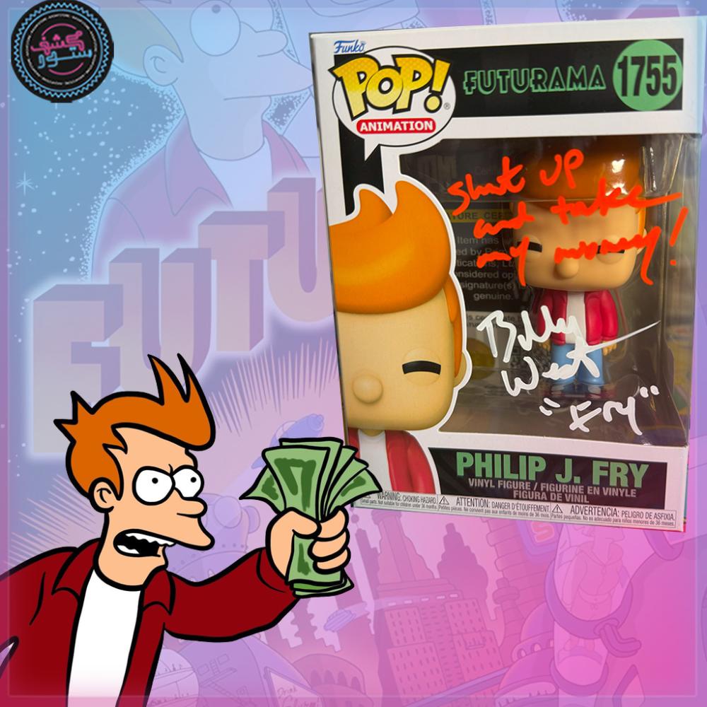 مجسم فانكو بوب إصدار رقم #27 يعرض الشخصية المحبوبة فيليب جي. فراي، عامل توصيل البيتزا الذي استيقظ في القرن الـ31، موقع بخط يد المؤدي الصوتي بيلي ويست، أحد أعمدة الأداء الصوتي في أمريكا.