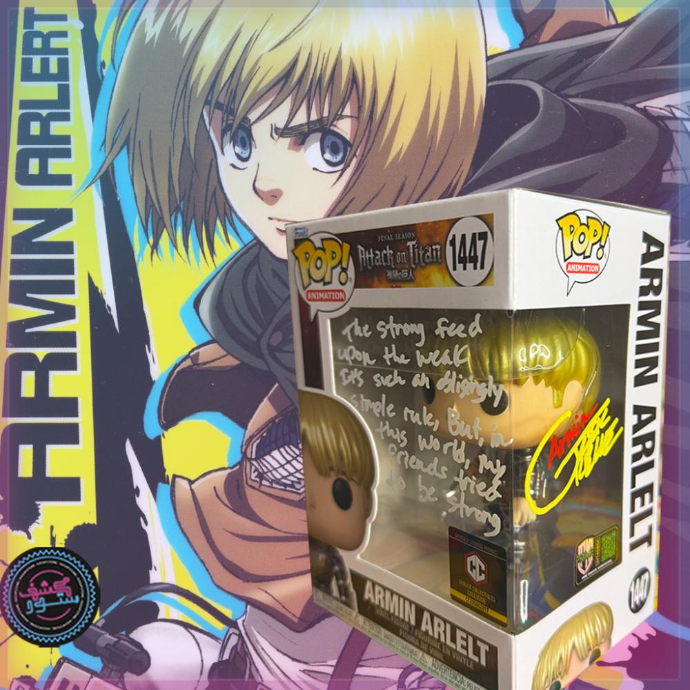 فيجور فانكو بوب للشخصية المحبوبة أرمين أرلِت، الإصدار رقم #1447، موقع بخط يد المؤدي الصوتي الأمريكي جيسي جيمس غريل (Jessie James Grelle)، الذي جسّد صوت أرمين في النسخة الإنجليزية من الأنمي.