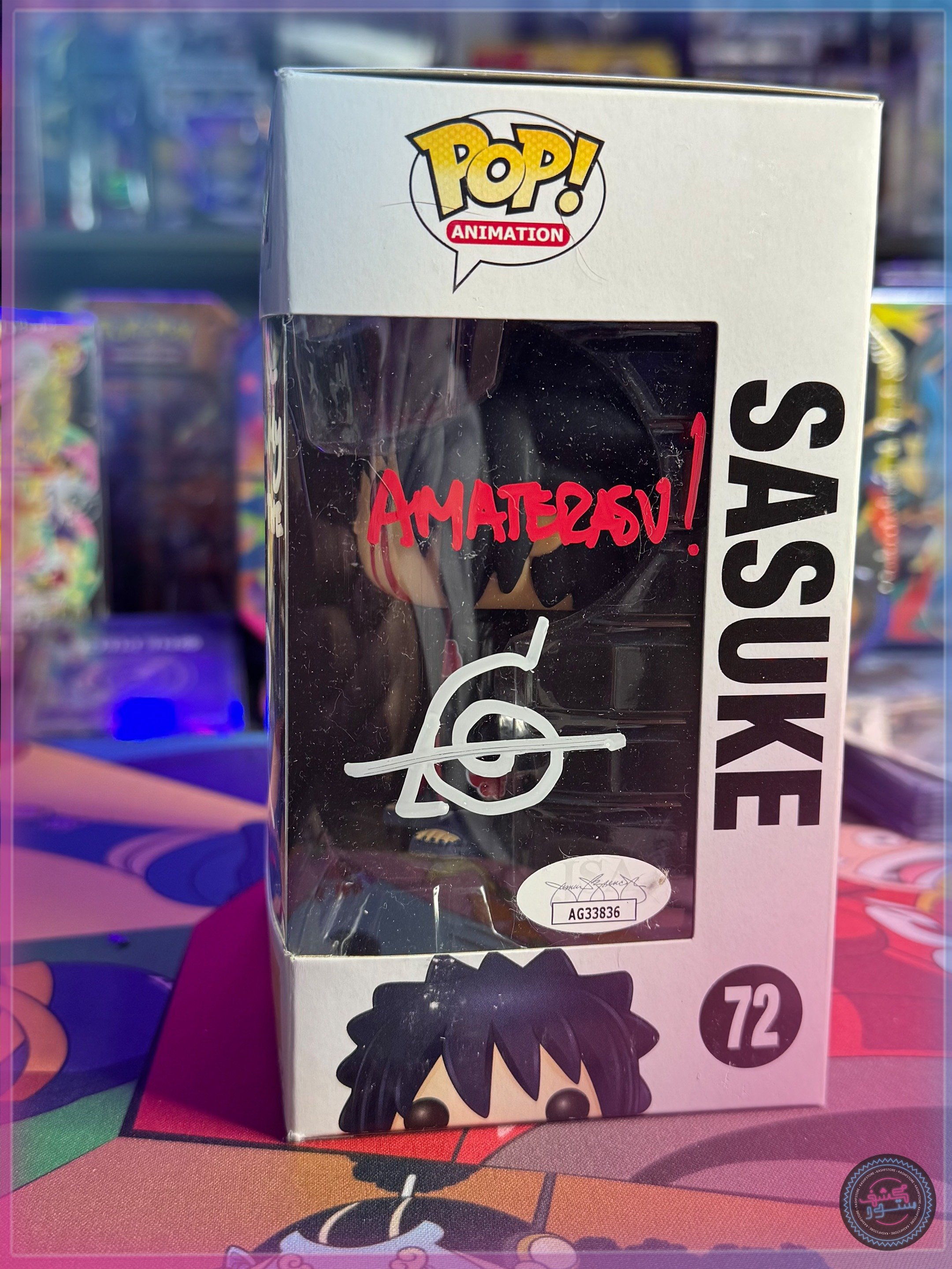 القطعة موقّعة من Yuri Lowenthal، المؤدي الصوتي الإنجليزي الرسمي لشخصية Sasuke Uchiha، مع اقتباس مكتوب بخط يده يضيف قيمة عاطفية وتاريخية لا تُقدّر بثمن.