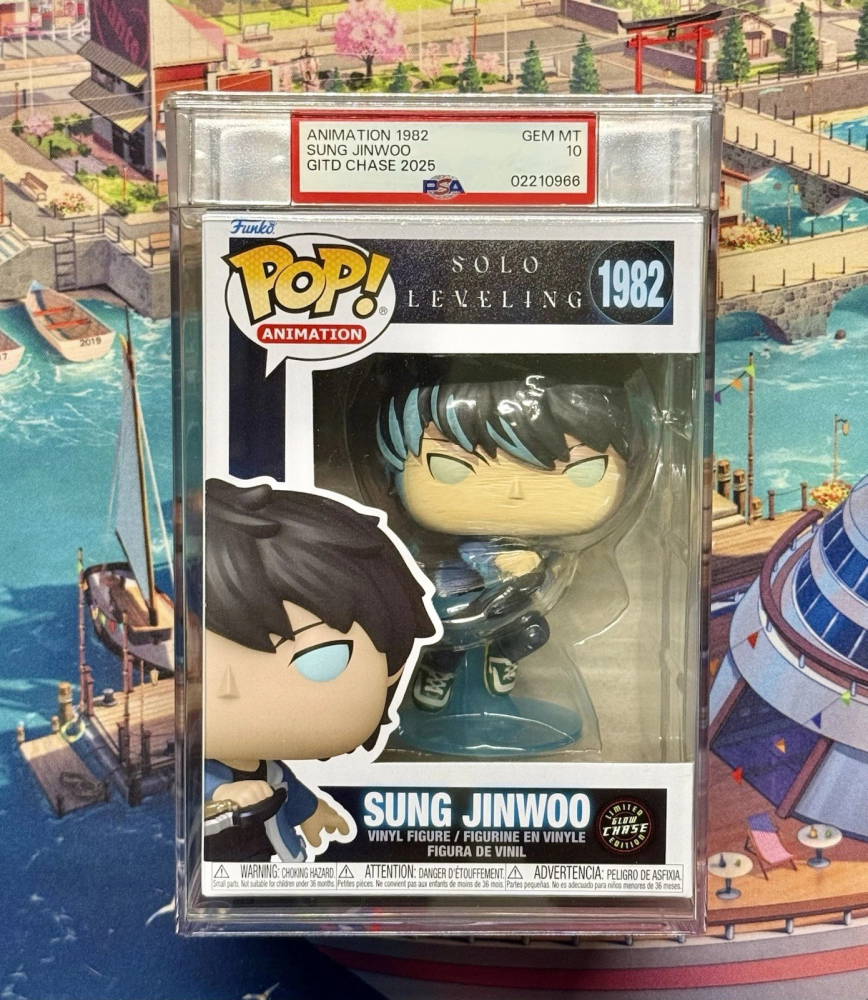 مجسّم Funko Pop Sung Jinwoo Glow Chase #1982 PSA 10 هو قطعة نادرة لمحبي Solo Leveling وجامعي الفينيل.