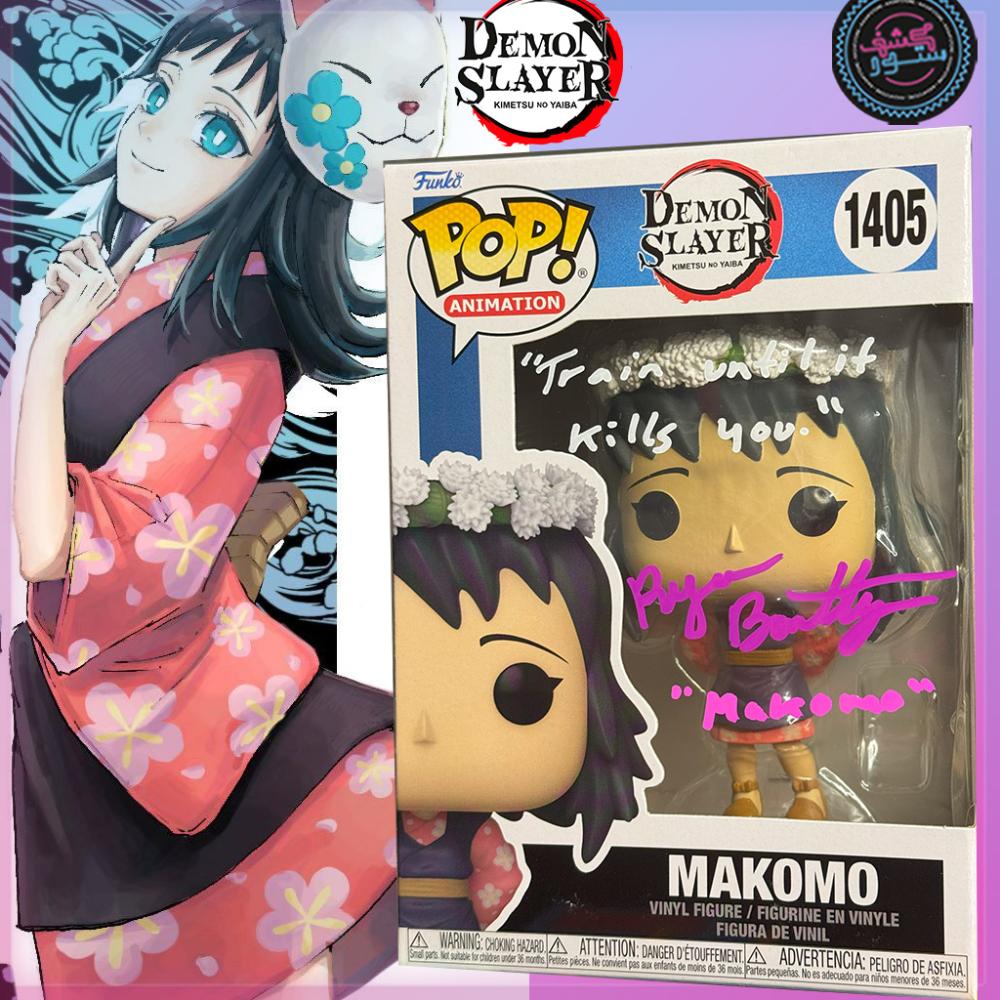 مجسم فانكو بوب إصدار رقم #1405 يعرض الشخصية الهادئة ماكومو، التي ظهرت في آرك تدريب تانجيرو، موقع بخط يد المؤدية الصوتية رايان بارتلي، المعروفة بأدائها الرقيق والمؤثر في النسخة الإنجليزية من الأنمي.